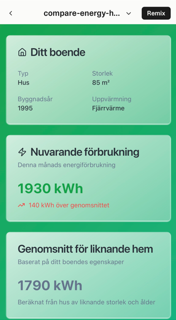 Grundidéen är att man ska få belöningar desto mer energi man sparar i sitt hushåll i jämförelse till medelmåttet. Appen ska få oss människor att bli mer motiverade att spara energi. Vår lösning är att man ska få dessa belöningar i form av kuponger från företag som sponsrar oss. Företag kommer vilja sponsra oss då vi både marknadsför deras företag och det ser snyggt ut för dem att bidra till att människor använder mindre energi.