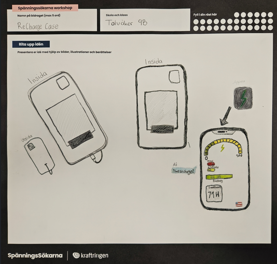 Temat är smarta energilösningar i en digital värld. ReCharge Case minskar energibehovet och kombinerar en smart energilösning med AI och sensorer. Med hjälp av AI:n i appen så kan du lätt följa och styra ditt sparande.