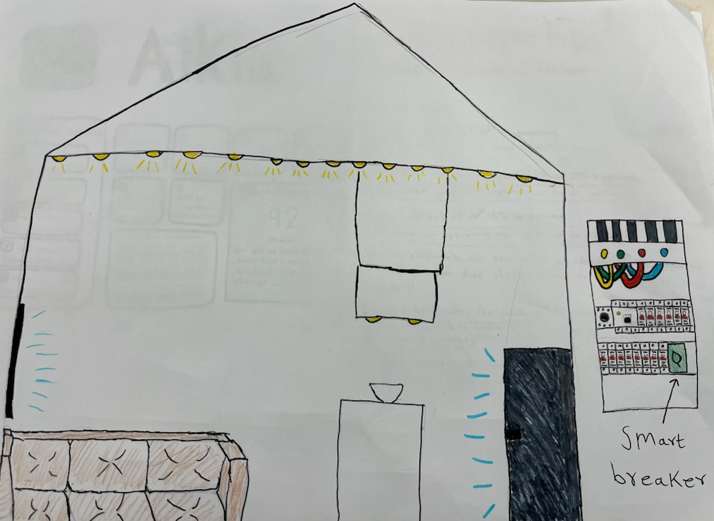Med hjälp av vår fysiska apparat, smart breaker som är en box som med hjälp av en elektriker kan installeras i ditt elskåp/proppskåp. Kommer den att kopplas till både huvudströmbrytaren i huset, samt andra små proppar. Den kan på så sätt mäta och styra strömmen, som går till olika delar i huset, till exempel badrum och kök. Den har även små reläer, brytare, vilket gör att den kan stänga av eller sätta på strömmen till varje säkring. Apparaten är utrustad med en Wifi modul. Den kommer på så sätt kunna kopplas till hushållets trådlösa nätverk. Via internet kan den kommunicera med vår app, alltså skicka data och ta emot kommandon. När användaren använder appen för första gången kommer man att koppla ihop den med apparaten via Wifi, ungefär som när man kopplar en mobil till en smart högtalare för första gången.